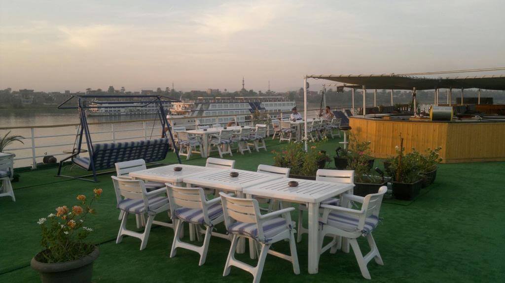 Los huéspedes pueden relajarse en el bar salón o disfrutar de noches temáticas de entretenimiento, que incluyen danza del vientre, fiestas de galabeya y música en vivo. La amplia cubierta solar incluye una piscina, un bar junto a la piscina y muchas zonas con sombra y tumbonas, perfectas para disfrutar de las vistas escénicas del Nilo. Otros servicios incluyen una sala de fitness, servicio de masajes, acceso a internet y una tienda de regalos. Ya sea navegando entre templos antiguos o relajándote a bordo, el Crucero Radamis I por el Nilo ofrece la combinación perfecta de descubrimiento cultural y relajación de lujo en el Nilo.