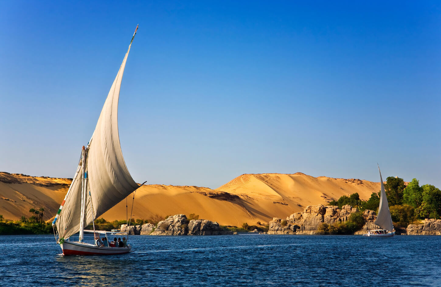Su viaje comienza al embarcar en una feluca tradicional, un velero de madera, para deslizarse tranquilamente por el río Nilo en Asuán. Mientras la suave brisa llena las velas, disfrutará de impresionantes vistas de las exuberantes orillas del río, las dunas de arena dorada y lugares emblemáticos, como la Isla Elefantina y el Mausoleo de Aga Khan.